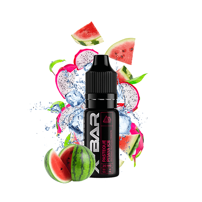 Flacon de 10ml de e-liquide X-Bar saveur pastèque mélangée à de la pitaya. Disponible en 10 ou 20 mg/ml de nicotine.